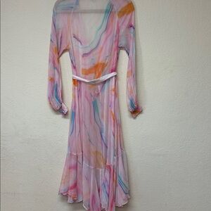 This elegant maxi dress features a beautiful blend of pink, orange, and blue hues. Perfect for any occasion, it offers a stylish and comfortable fit.