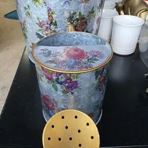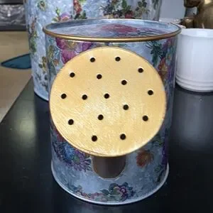Pamper your prized petunias or your houseplants with a drink from the Flower Market Watering Can. Made of galvanized metal and decorated with our Flower Market pattern, it has a brass-finish handle and