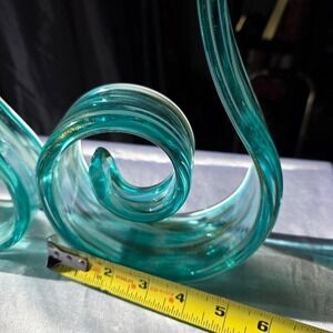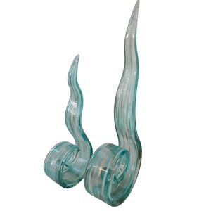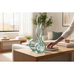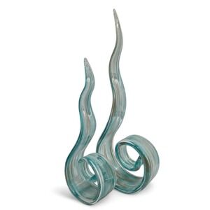 Elevate your space with this striking Murano style abstract glass sculpture. Its mesmerizing teal blue hues and dynamic swirling form create a captivating visual experience. Thin, elegant ribbons of glass twist and curl, culminating in sharp, upward-sweeping points, evoking the fluidity of water or the graceful unfurling of a fern. Subtle golden undertones shimmer within the glass, adding a touch of sophistication and depth. This piece is perfect for adding a modern artistic statement to a console table, bookshelf, or mantelpiece, bringing a serene yet dynamic energy to your living room or office.
