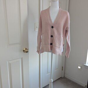 This sweater is soft, ribbed pale pink and oversized and a great modern style. It has patch front pockets and small side slits at the hem. The buttons are slightly over-sized to match the look of the sweater. Reminiscent of a weighty fraternity or "boyfriend" sweater but with a true feminine appeal. Purchased for an event and once once. Smoke free and pet free home. Fell free to ask for measurements. Would fit a 4 through a 10 because of its style.