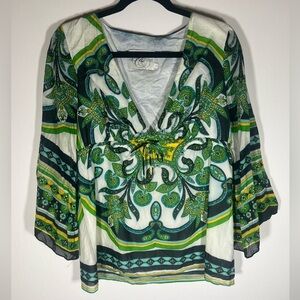 Vintage Y2K Alice & Trixie green blue paisley v-neck babydoll bell slv top sz L