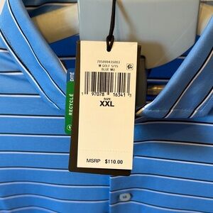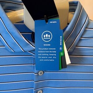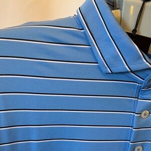 Stylish light blue polo with white stripes. Ideal for casual wear. Lightweight golf polo wickening material