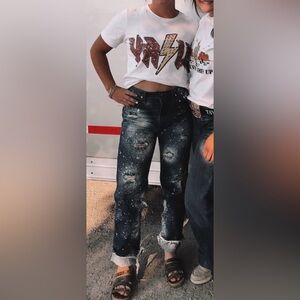 Trendy blue jeans featuring a striking white splatter design. Distressed accents add a fashionable touch.