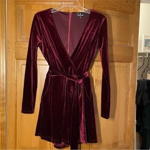 Elegant velvet romper in deep burgundy. Features a flattering wrap design.