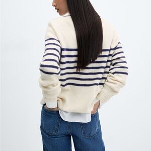 This stylish V-neck oversized sweater from Mango features a cream body adorned with bold navy blue stripes across the chest and upper arms. The contrasting navy blue trim along the neckline enhances its nautical-inspired design, making it a perfect addition to any wardrobe.