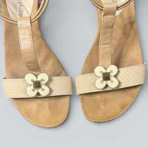 Cork wedge sandals by Lindsay Phillips in a tan / beige tone with a cushioned footbed and decorative floral accent. Comfortable, lightweight style for everyday wear.