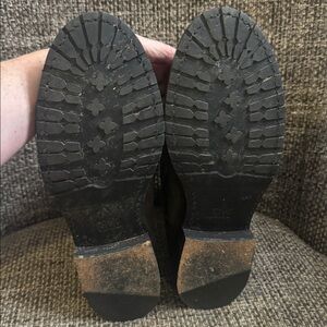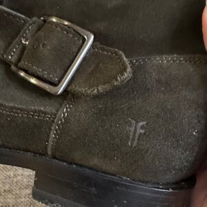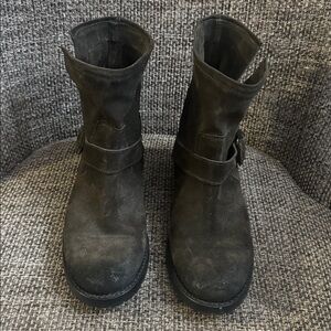 Frye Natalie Short Engineer boots. Brown suede with distressed toe size 7. Buckle accent. Perfect shoes to pair with a dress or Free people style pants!