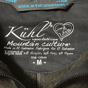Stylish Kuhl sweater jacket. Black/brown with gray accents. Full zip front. Two front pockets.