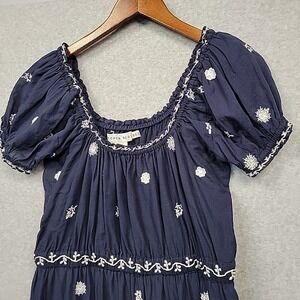 The GRETCHEN SCOTT Big Love Dress in Blue is a stunning embroidered midi/maxi dress featuring an off-the-shoulder neckline and puff sleeves, perfect for travel, parties, or casual occasions in the summer, fall, or spring. Made from 100% cotton, this lightweight dress has an elastic waist, lined interior, and pockets for added comfort and convenience. The white floral pattern and blue color give it a feminine and bohemian vibe, making it a stylish choice for women looking for a designer piece that is both colorful and peasant-inspired. Note: Please see photos for condition details and measurements. Good pre-owned condition. Missing a single bra stay snap on the interior right shoulder. Can be worn on or off the shoulder.