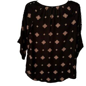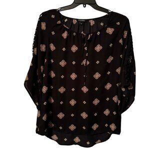 Roz & Ali Black Patterned Blouse Sz L 3/4 Sleeve Tie Neck women top