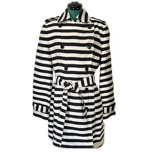 Women’s Size 8 Striped Trench Coat. 60%, Rayon 27 % Polyester, 13% Nylon 23 in sleeve, 19.5 in across chest, 31.5 in length.