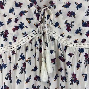 Promesa boho peasant blouse in size Medium featuring an allover floral print in navy, burgundy, and mustard on an ivory background. Designed with a flattering V-neckline, adjustable tie front with tassel detail, and delicate crochet lace trim across the bodice. Long sleeves and a softly flared, flowy hem create an easy, feminine silhouette perfect for casual wear, layering, or festival-inspired outfits.