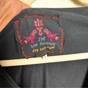 Beautiful Johnny Was black cotton dress featuring signature boho floral embroidery along the hem. Soft, flowy silhouette with a flattering V-neck and gathered bust detail. Easy pull-on style that pairs perfectly with boots or sandals.