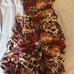 Turn heads with this stunning strapless dress featuring a bold leopard print and rich red floral accents. Perfect for a night out or special occasion.