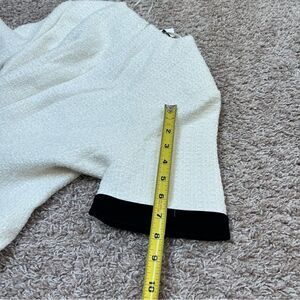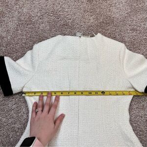 MABLE Tweed Mini Dress with Rhinestone Buttons. Size small. Cream shimmery tweed with a black velvet or velour trim, including a beautiful bow at the neckline. Buttons on front are like rhinestone gem bursts, the dress does come with a spare in case you need it! Zipper back. This is fresh out of a poly bag so I could provide measurements - it’s never been worn! Made of polyester, rayon, and spandex. The dress is lined. Some structure to sleeves and skirt for a cute and classic look when worn. This gives major luxury vibes, looks like Chanel!