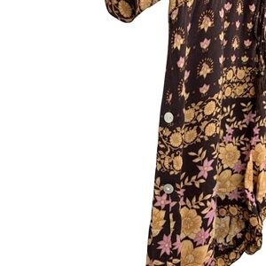 This super cute boho style romper features an all over mixed floral print, a v-neck line with mother of pearl looking buttons, sleeves that come to the elbow, button and tabs at the sleeves and shorts to make each shorter, and a drawstring at the waist with small bells at the tassel. The fabric is thin and therefore ever so sheer. Slightly faded look.