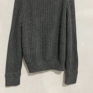 This sweater has a rich charcoal gray tone and a deep ribbed knit texture that gives it structure while still being cozy and lightweight. The yarn blend makes it incredibly soft without bulk, perfect for layering or wearing on its own during cooler seasons.