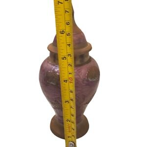 Vintage brass ginger jar features a purplish enamel finish with textured brass sea theme accents. This lidded vessel showcases a unique swirled pattern in the enamel. It was made in india, it has some patina adding to beauty! Its like a purplish pinkish color.