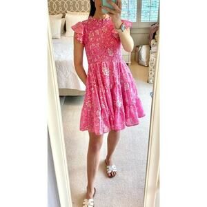 J.Marie Rosie Ruched Dress Smocked Pink Floral Ruffle Cotton Oliphant Style NWT