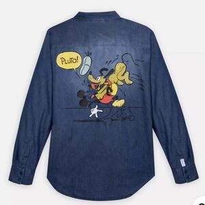 Disney Parks Her Universe Mickey and Pluto Comic Denim Shirt. The shirt features vintage-style screen art of Mickey and Pluto on the back, with a "Pluto!" speech bubble, and embroidery of Mickey on the front pocket. It is made from 100% cotton, is a unisex style, and has a full button front. size XL
