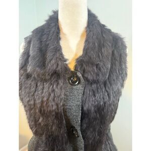 Vintage Dana Stein Real Rabbit Fur Trim Gray Wool Vest Sz M Drawstring Back