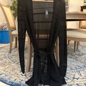 Elegant black open-knit cardigan. Features a stylish belt. Perfect for layering.