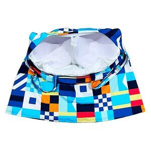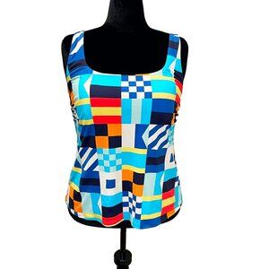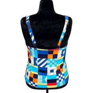 • Tankini top (16W) — square neckline, underwire support, adjustable straps, “Colorblock Flag” print