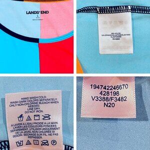 Complete 3-piece Lands’ End swim set in a bright nautical colorblock print plus solid turquoise shorts — designed for comfort, modest coverage, and easy sun-safe layering.