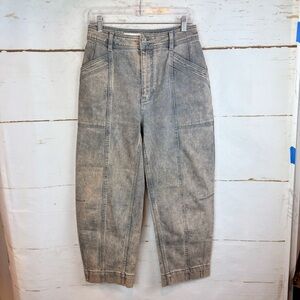 Pilcro light blue and pink acid wash barrel jean with front zipper and double button closure. Pre-owned. The bottom of the two buttons is loose (pictured) but otherwise excellent condition.