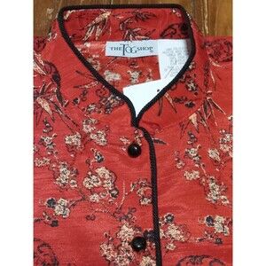 New with Tags Size 14 The Tog Shop Asian style blouse red/black button up with bamboo and flowers pattern, Has black round buttons for closure! Very Pretty Blouse! Love the colors and pattern! Also comes with extra buttons in packet! Shoulder pads and looks like they can be removed if choose to, Please check out all pics for measurements and details!