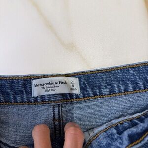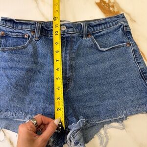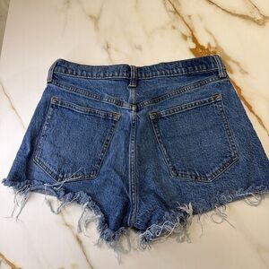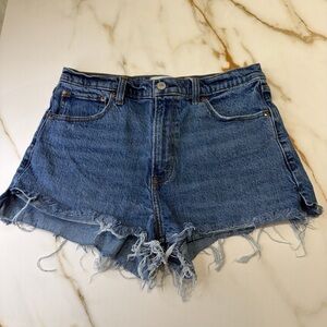 Classic blue jean shorts with frayed edges. Casual and versatile style.