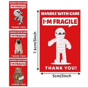 Red stickers with 'Handle With Care' and 'I'm Fragile' text. Features cartoon characters. Perfect for packaging. 3inches by 2 inches