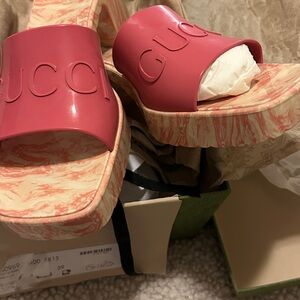 Gucci platform slides. Bold pink with marble accents. Perfect for casual elegance…..If asking price is given..you will receive both duster and box…if not…you’ll get the box with the sandals 🥳🥳❌❌