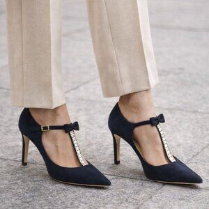 Kate Spade pumps, navy suede heels, T strap pumps, bow heels, crystal accent heels, pointed toe pumps, Italian leather heels, designer pumps, evening shoes, cocktail heels, wedding guest shoes, party heels, luxury heels, women’s heels size 7