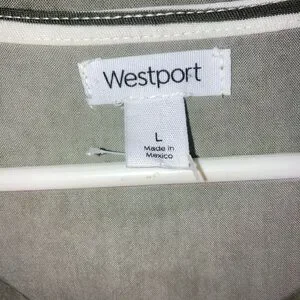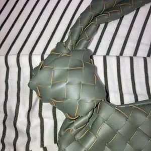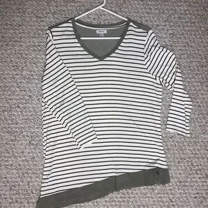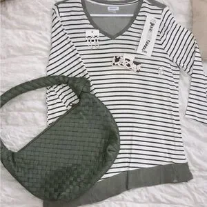 Stylish striped V-neck top paired with a green woven bag. Perfect for casual outings.