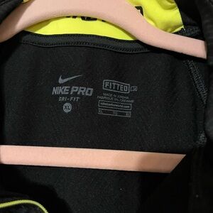 Nike Pro Dri-FIT top with black exterior and yellow interior accents. Fitted design for performance.