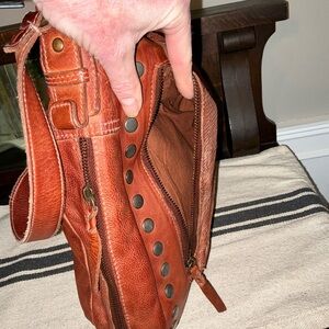 Features three outer zip pockets, one inner zip and two slip pockets, a zipper along the sides and bottom allows for expansion for more storage. In Bed Stu classic Cognac leather. 13 in. W, 12.5 in. H, 4 in. D. Strap drop 11 inches. Strap length 24 inches.