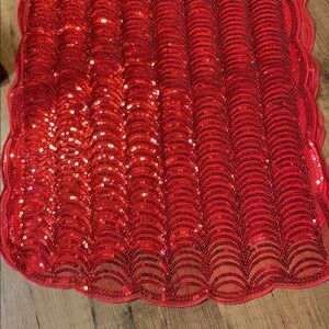 A red scarf set. One is La Llama with 80% alpaca wool with fringe, width 9”, other is red sequin with scalloped edges, width 21”. Great set!