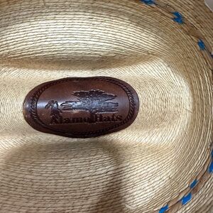 Alamo Hats structured, stiff straw dress hat with a wide brim and blue woven accent detailing throughout the brim and crown. Finished with a suede band and metal logo detail.