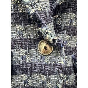 The Veronica Beard Blue Multi Tweed Cutaway Dickey Jacket Blazer in size 2 is a stylish and versatile outerwear piece for women. Made from a cotton blend with a textured plaid/tweed pattern in shades of blue, this blazer features long sleeves and a 100% polyester lining. Perfect for any season, this blazer from the renowned brand VERONICA BEARD offers a classic yet contemporary style for the fashion-forward woman.