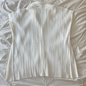 Issey Miyake Pleats Please sleeveless pleated top in classic beige.