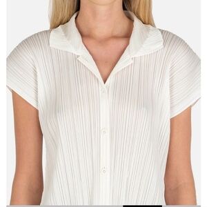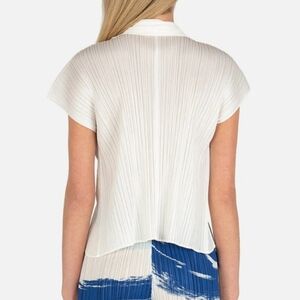 Signature micro-pleated fabric with sculptural drape that stretches and returns to shape. Button-front closure with pointed collar and wide cap sleeves for a modern, architectural silhouette.