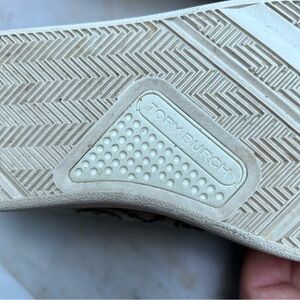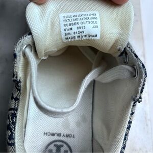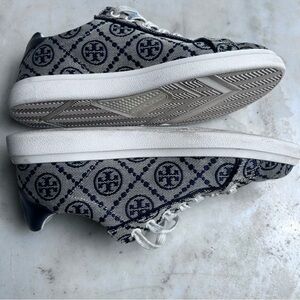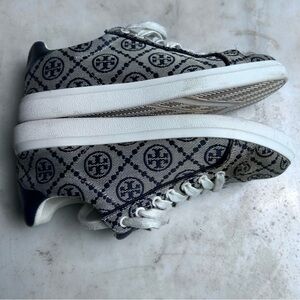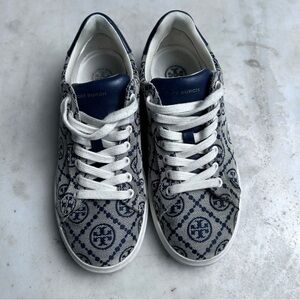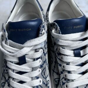 Designer sneakers with Tory Birch signature pattern. Features blue accents and cream base. Textile and leather upper.
