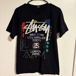Stussy World Tour Scribble Graphic T-Shirt Mens Medium Black Short Sleeve Tee