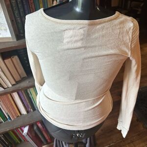Free People Henley, scoop neck, fitted, long sleeve shirt. Approximately 15 inches from armpit to armpit, 25 inches long. A couple of small untreated spots on the sleeves. Embroidered star near the hem. In good, used condition. From a pet and smoke free house. Happy to bundle!