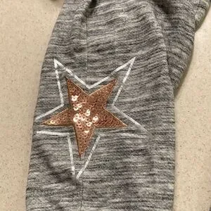Design: Gray marl fabric with rose gold sequin star graphics on the legs.