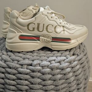 Elegant off-white Gucci sneakers featuring bold logo and signature stripe. Ideal for everyday style. Worn a few times. Super cute to be dressed up or down.