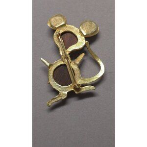 Vintage 1960's Mouse Brooch Gold Tone Wood Accents Red Rhinestone Eyes Adorable