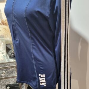 Victoria's Secret PINK half-zip navy blue with white and black striped sleeves.