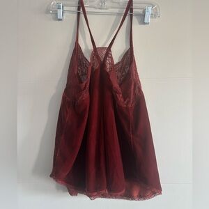 Elegant burgundy camisole with lace details. Perfect for layering or wearing alone. Soft and stylish.